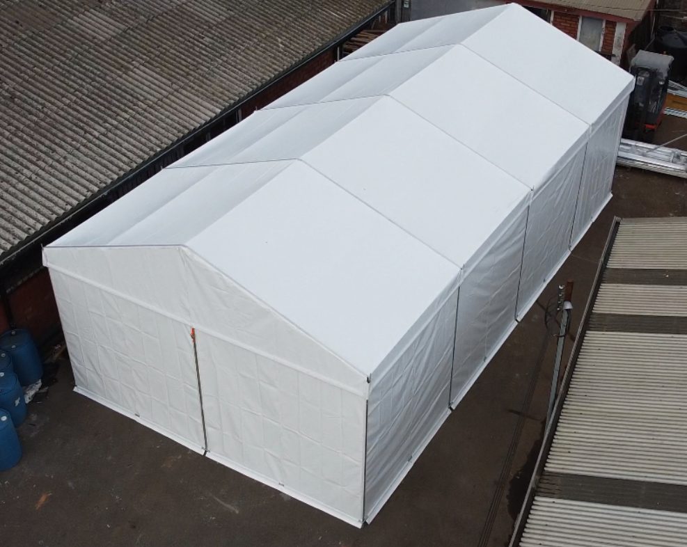 Galpón recubierto en tela de PVC poliester sellado mediante alta frecuencia, retardante de flama con estructura de aleación de aluminio.